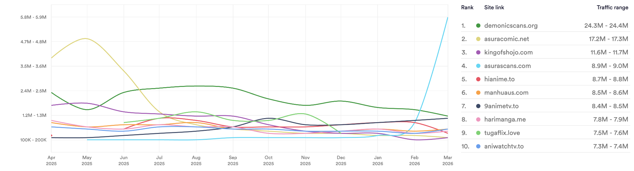 The following chart shows the top piracy domains accessed by users in Portugal between April 2025 and March 2026. This visibility can help shape smarter, site-specific takedown and blocking measures.